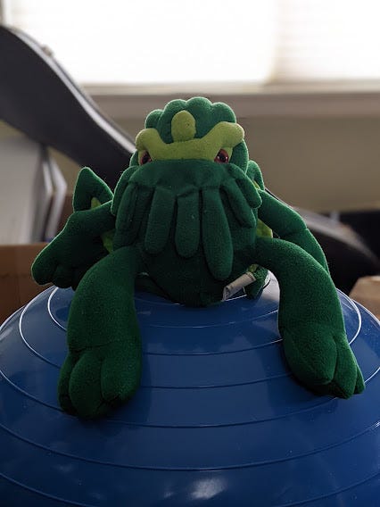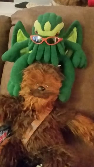 Due to a collision of events — we returned late to Comicon — Her Mother was specifically angry as opposed to our usual discomfiture — Tessa asked me to point out something I liked — the stuffed Cthulhu in the great-swag- hall called to me — perfectly summarizing the trip — when she bought it for me I hid my tears
