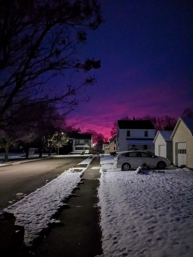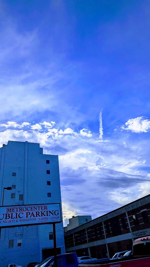 There there, it’ll be alright. BeReal’s down for the moment. Look: a swirling serpent of cloud. Will-o-the-wisp. I watched a square shouldered man tangle with the metal tigers of cars edging around him on Fullerton in a forced migration of metal stopping and starting, honking and stuttering. My cold brew had a paper straw. It was cold out and the paper straw was cold. January in Chicago. Why a cold brew? Why outside? Mysteries abound…