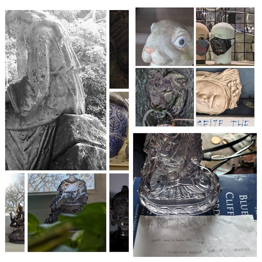 Photocopying Buddha Con/Jur/d, 4/17/2025 There’s a Buddhist Temple, we’ve been told where the only ritual objects are photocopies of a photocopy of a statue, which in turn, in turn in turn, is a generic depiction of a smoothed Buddha, the anthropomorphic smiling lump, hands folded, wrapping the entire world in this embrace. A friend once asked us YOU'RE NOT SAYING EVERYONE SEES THE SAME THING? are you? this is why It's good to have a teacher, when you see they believe in the silliest sillies, unlike a photocopied Buddha, they have real warts, real zits, and occasionally when sitting fart too loud and even after years and years of practice, mix up Dharma and Delusion, (the best ones admit it and laugh laugh, laugh, laugh and move on) you realize, YOU can do it too YOU can become Buddha, YOU already are Buddha YOU just need to hold up a copy of a copy of a selfie to PROVE, beyond all doubt, it.