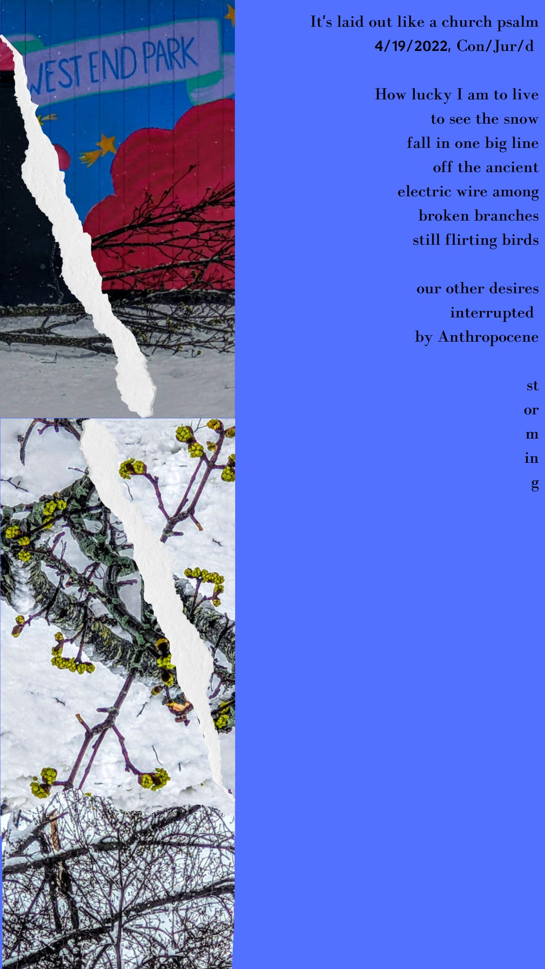 I won’t say alive, I won’t say dead 4/19/2022, Con/Jur/d 1. “You didn’t really die” she would say, when I would tell the old story to someone new, this was after the hate the victimology had become the secret background the vocal cords which expressed even warm words with a smoker’s hacking cough 2. “If you hate my stories you don’t like me,” Why did we pretend otherwise? The koan, she would have been annoyed by this disambiguation incapable of seeing the entwining, entangling emptiness around, through, penetrating us went something like this: The Teacher takes a student to a funeral and hitting the coffin says “Alive or dead?” The response, “I will not say” echoes down the halls of history 3. The first dream I’ve had of her since The Nastiest Year (s) certainly, since I heard she was dead, she is in a room down a labyrinthian hotel hall, and I was can’t believe I’m saying this without worry without flinching looking for her I know can you believe it? Not since I told her to go and she said no, again and again, was there anything but shadowed lies of innocence deliberate ignorance between us. 3. Now that you have relocated and we no longer have to lie or live in terror of past selves inconveniencing the present I need to know what you think of the old stories, is it true I was alive and merely incon- venienced, or dead? Despite everything, typically, you will not say.