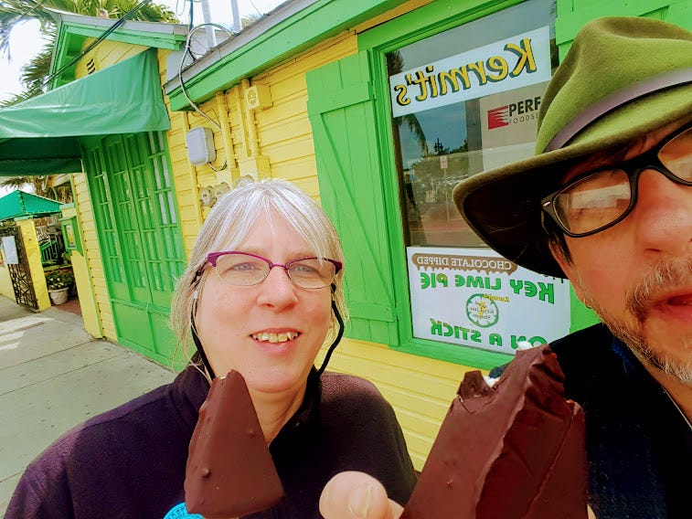 I lied. This is the picture of eating the chocolate-covered key-lime pie in Key West. I was worried. You see after the surge in people hitting the ‘like’ icon I was certain the next post wouldn’t live up to your expectations. What can I offer you, a dream within a dream, not even a ‘real’ meal. Luckily, it was a moments research using the search function on Google to reveal you can get an entire pie for yourself for the low, low price of $129