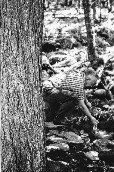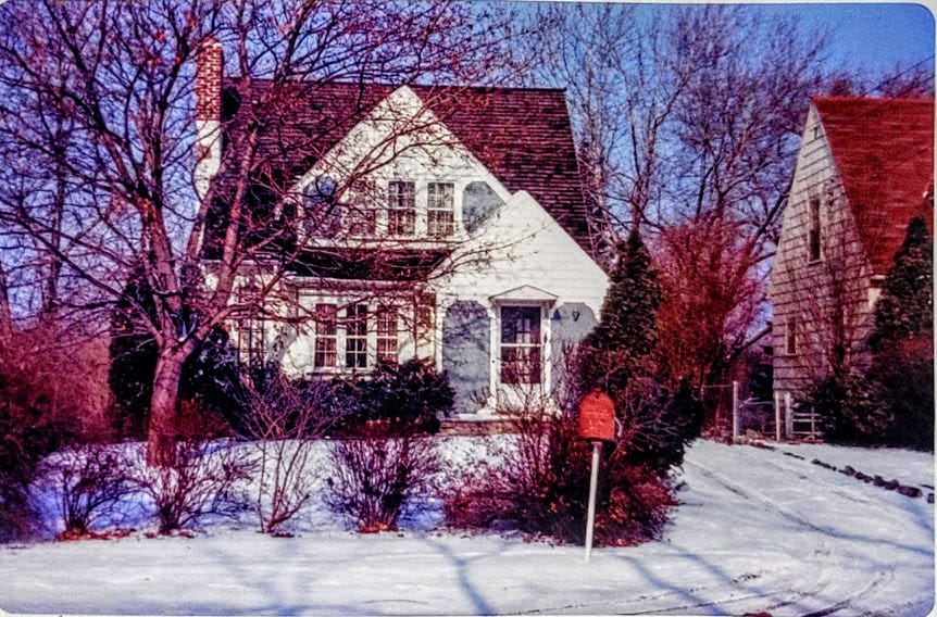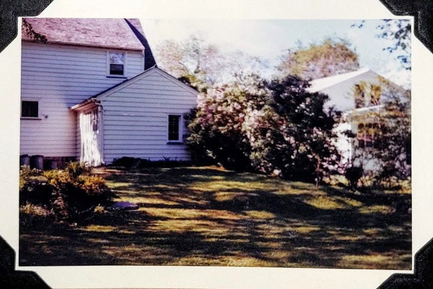 “Here’s a view of the House from the back — While I was trying to fall asleep a few nights ago, I was thinking about the slight rise on the right corner of the house where I would hide beneath the branches of that tree and cry when called to do so — Just behind the cameraperson is where the stump my father would try to burn out, lay and where I fell into the embers — In the foreground where the shadows collect, is where the fire circle for the girl guides was built — For years I thought a dream I had of the fire circle was how I was burned — Not until the age of 12 when my Mother heard me telling my scarification origin story to a friend, was I set right”