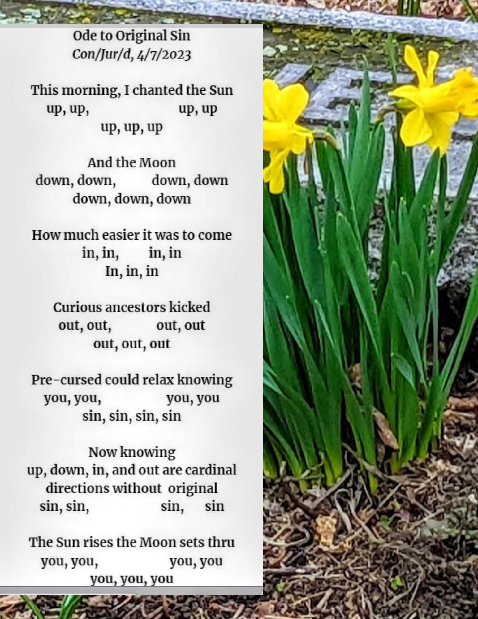 “have laws prohibiting certain acts such as dancing and horse racing, in remembrance of the somber nature of Good Friday” Wikipedia, 7 April 2023 15:20 UTC Con/Jur/d, 4/7/2023 Can I wear shorts? or are these times too somber? my legs scarred by psoriasis the doctor seems taken aback by my lack of concern, UV radiation seems to help although, I have fair-skinned friends, who even now struggle with consequences they never ask us should we use depleted Uranium? find other uses for petrochemicals liberal applications to every cell sprinkled in water, food, air even salt, in case you missed it, yet they still call it Democracy Although, despite never having participated or cast a vote against dancing or horse racing (to be clear, the racing seems a bit cruel and I won’t miss it) There is an insistence this is true (Maybe, we can’t write it due to a lack of sleep) And it's not the resurrection objection there is precedence in every avian flirtation and the other dumb rushes of spring leaving us feeling hollow, ungrounded but this celebration, perpetration of a cruel history, empathy for the dead No room left for the living it seems a little cold for shorts maybe, tomorrow.
