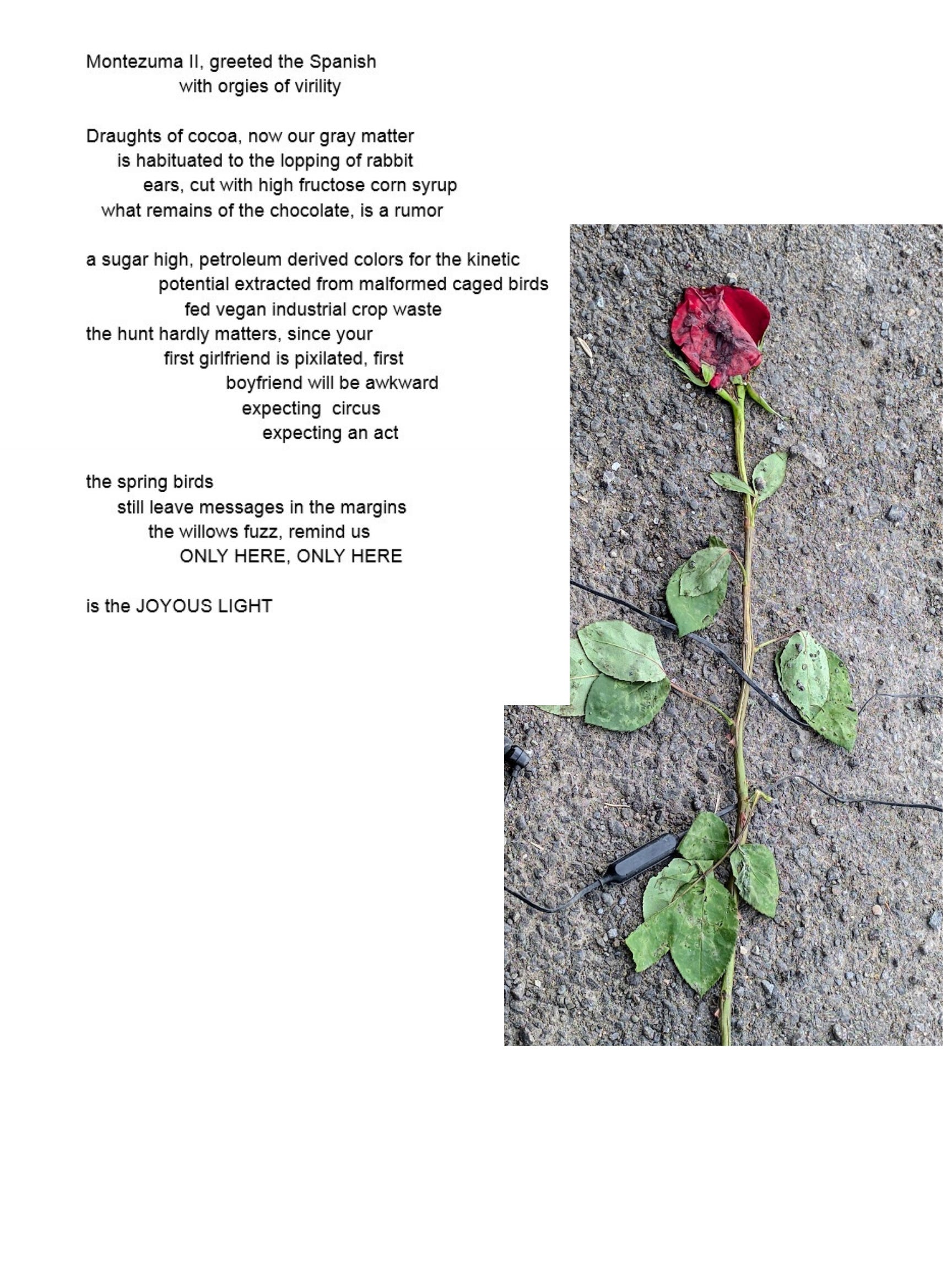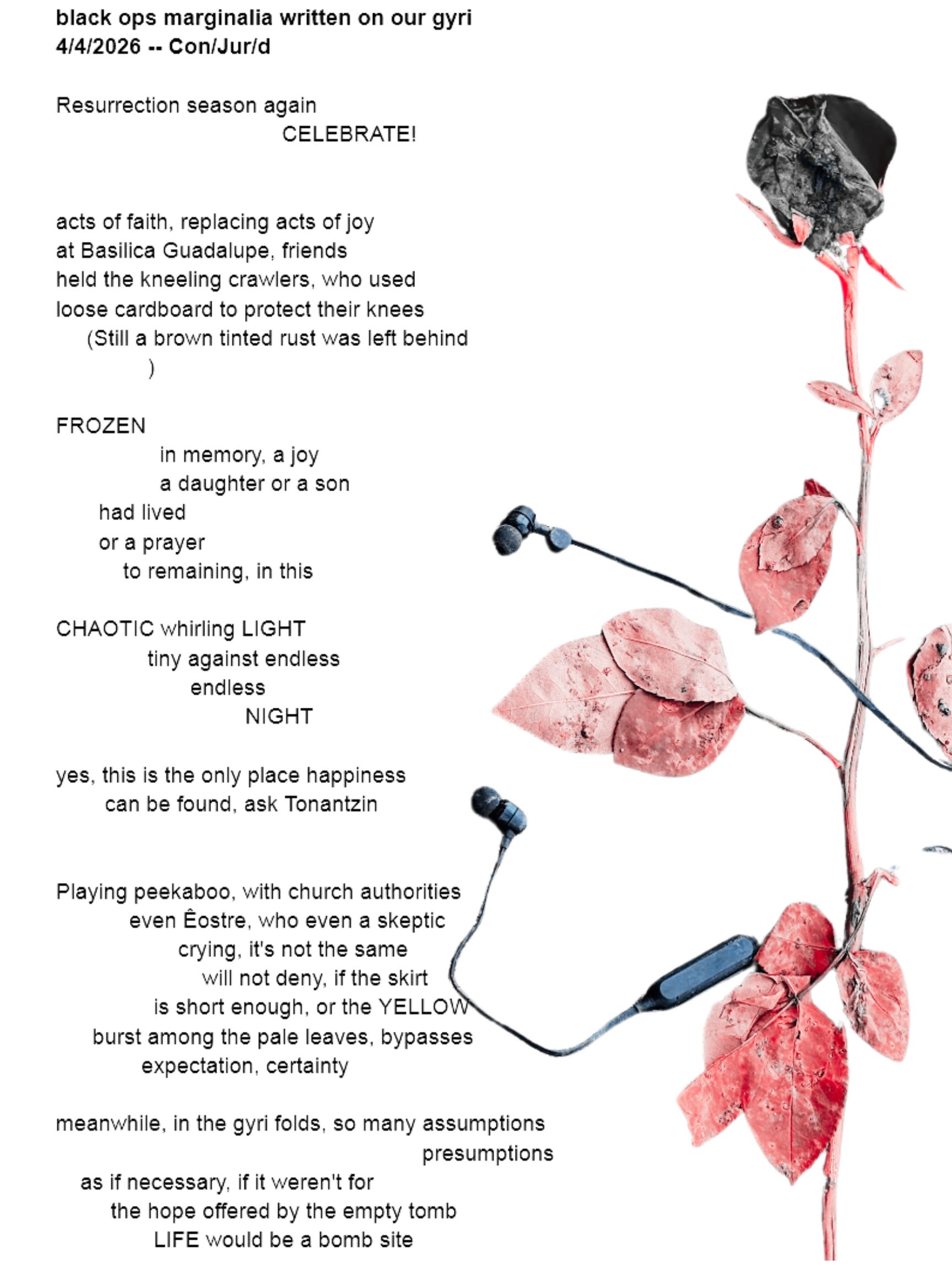 In the spring, we tell the old stories again and again Con/Jur/d, 4/4/2026 Spring has been too much all winter practiced being dead forgot about the pain of rebirth how suicides rise with the sap don't blame those who are trying to escape, the tomb is empty in modern parlance because it’s prime real estate a perfect starter home, there will be condos on the hill Bernard now looks like a prophet who believed in the resurrection, and the punishment saying heaven was wishy-washy belief bullshit, intuiting 40 years ago how many Americans would practice, an unbreakable faith in hell, yet, skeptical of the grace Tim was murmuring Kierkegaard Bernard, running low on cocaine spat out the word, EXISTENTIALISM in his thick John da Baptist Norwegian accent, his warm van wrapped us in fish, stale beer yeasty men, brought to mind the allegory of the bird flying through the ancestral Viking lodge, the hope of Christ escaping into the cold beyond sans furs, family, or the retreat to Normandy THINK you know something about suffering about the shape of this thing, this life? do you? Jack his buddy, met and bonded in the Alaskan PTSD self-medicating underground, after each of their wars ended officially, leaving their gyri with endless skirmishes and adrenal GABAgeric loops, tried to steady him, grabbed a shoulder - I was sent over as a farming consultant, agriculturist, he said, lived, ate with those people fooled around, planted, drank, smoked compared, contrasted methods, and one day a voice over the static tells me, tells me, someone or someones is Vietcong and I don’t know who was, who is, who will become who who pretends to like me, plans on killing me false drinkers!, false laughter, the seeds sprout lies! FALSE false friends, lovers and it is April when we should be planting, planning we’re just picking and sharing fruit from spilling from the jungle, sharing like we were all communists (the ones we’re here to fight) and if they can behave this way, hard to ignore, to separate us and them WE GREW THE BIGGEST RADISHES YOU EVER SAW and what a shame, you know someone was going to slit my throat, and for a moment, nodding on some local sap, considered going back to being fertilizer, I couldn't I couldn't, tell them apart, so i killed them all, I KILLED THEM ALL! he was shouting now and we ran and ran into the outlines of trees, air thick with mosquitoes, moose left Jack was hugging him, left snot and tears, undone by bright ALASKAN STARS the aurora borealis threatens to take us into the dark/dark, over the EDGE we can't fall off, Tim yells, stretching out his arms taking the position: TO FALL TO FLY