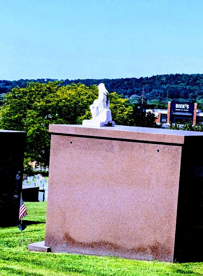 this perverted promise of life after, seems to grow more hollow the closer we get; note the squatting statue on the mausoleum roof, robes hiked up, ankles showing hopefully those left behind, saw how funny it was, holding off the ever present now