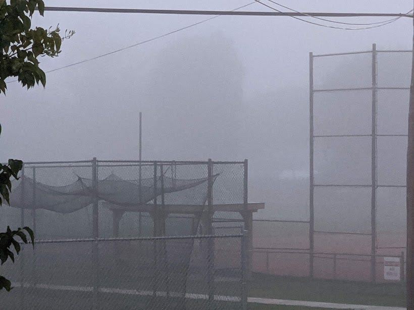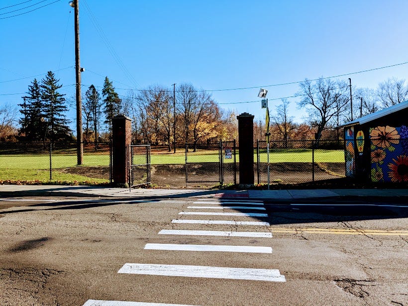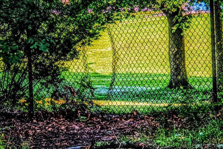 There is a hole in the fence between the park and the cemetery — and if the park is open — a nice — private shortcut between various universes