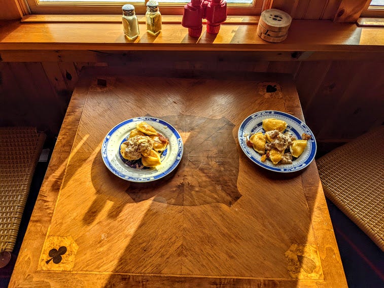 I didn’t plan our food as well for our recent trip. I’m not sure why, maybe, at some level, I didn’t think we would go. I love cooking. I love eating. Some of my favorite memories are around food, its consumption, its preparation, its discovery. I always had mixed feelings about the food-porn infesting our social-media accounts, until I started doing it myself. There is something about eating with our eyes first, although, I would argue, often we start eating with our nose long before we see the food. If you could smell this what would it smell like? Is rustic a smell? Has the wood lost its sappiness? Is that bacon or mushrooms? I’m sure, woodiness would play a part in that. I know of a frequent faster who takes cooking classes when fasting, claiming the food-satisfaction of eyes & nose more than makes up for his hunger. Just for fun get a piece of citrus lemon, lime, orange, or something more exotic like yuzu. Smell it taste it now look at the picture again. Has it changed? Or have you?
