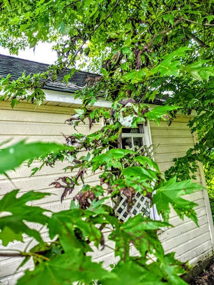“Transpecies psoriasis? Maybe a nutritional deficiency? What do I cook for the maple? Possibly a fungus? Maybe the sudden heat and humidity are contributing to leaf morbidity? As often happens, I had a hard time composing this because of what I was listening to, not because it interfered with the process, rather they said it better and I felt like I was stealing the feeling from someone else: Invisible Bodies — Lost Girls, Jenny Hval and Havard Volden”