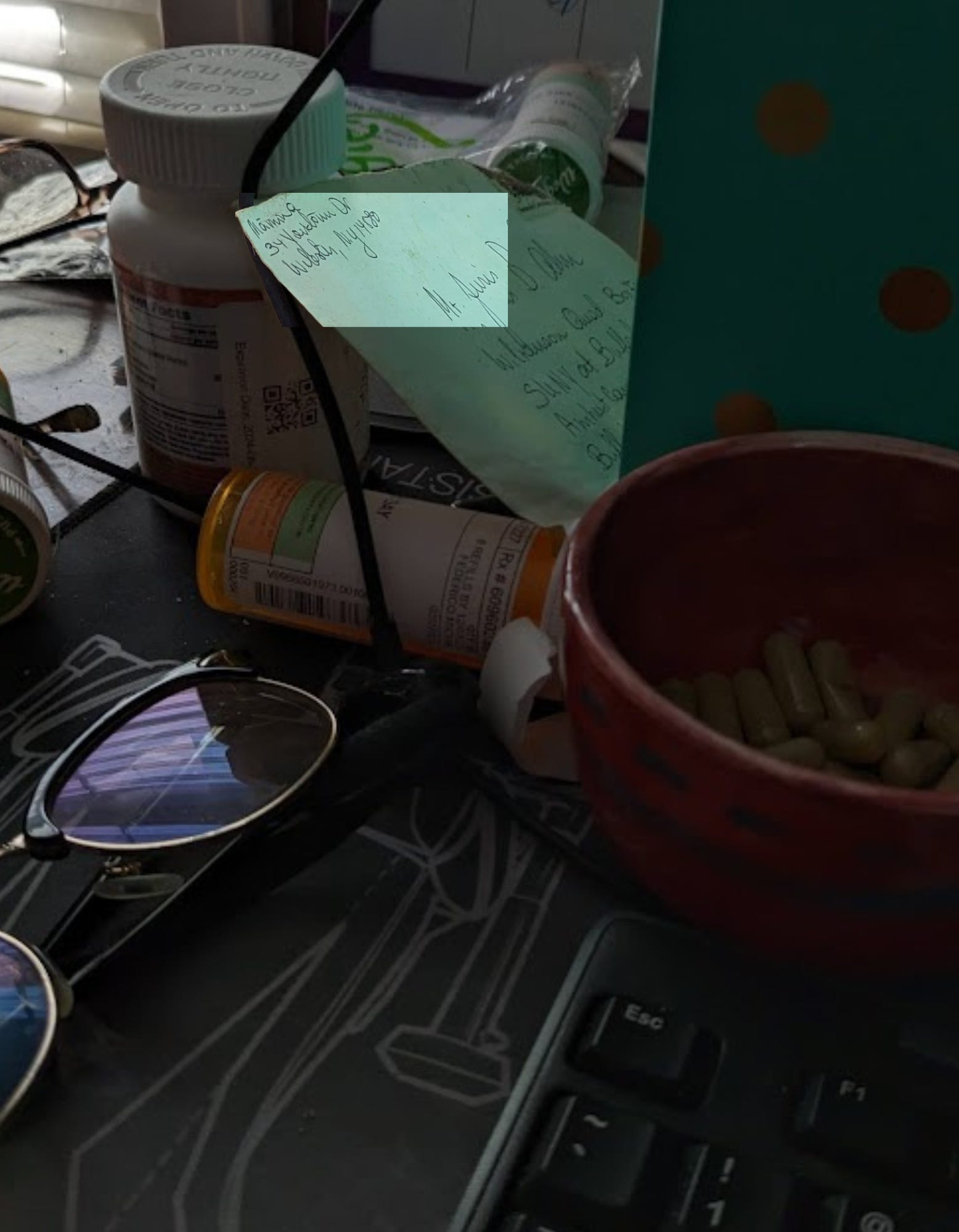 a letter Con/Jur/d, 4/4/2023 a letter 41 years old pre so much sits getting yellower, stacked between vitamins, meds, drugs of aging as well as The Age She wouldn’t have approved being a scientist from four generations passed Does it matter? She’s been gone almost 30 years now, but her cursive her humble ask I spend more time with her when I visit next time means more now than it did then.