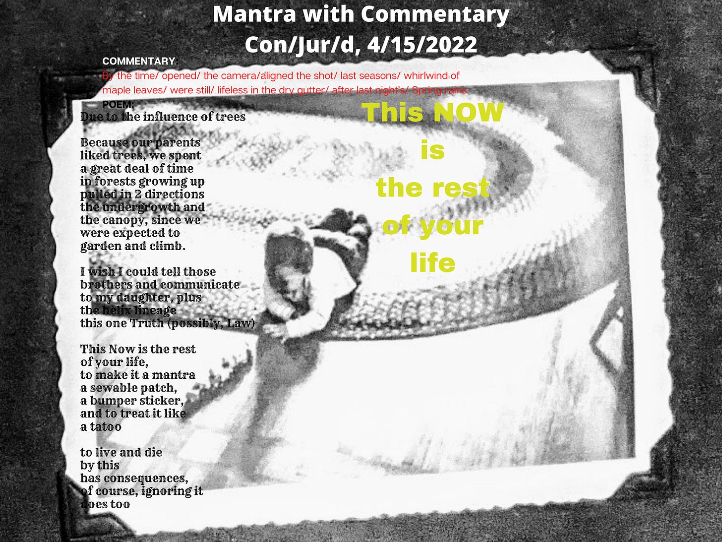 Mantra with Commentary Con/Jur/d, 4/15/2022 This NOW is the rest of your life COMMENTARY: By the time/ opened/ the camera/aligned the shot/ last seasons/ whirlwind of maple leaves/ were still/ lifeless in the dry gutter/ after last night’s/ Spring rains POEM: Due to the influence of trees Because our parents liked trees, we spent a great deal of time in forests growing up pulled in 2 directions the undergrowth and the canopy, since we were expected to garden and climb. I wish I could tell those brothers and communicate to my daughter, plus the helix lineage this one Truth (possibly, Law) This Now is the rest of your life, to make it a mantra a sewable patch, a bumper sticker, and to treat it like a tatoo to live and die by this has consequences, of course, ignoring it does too