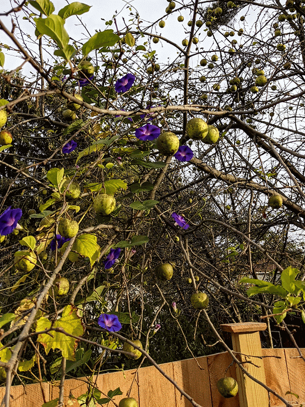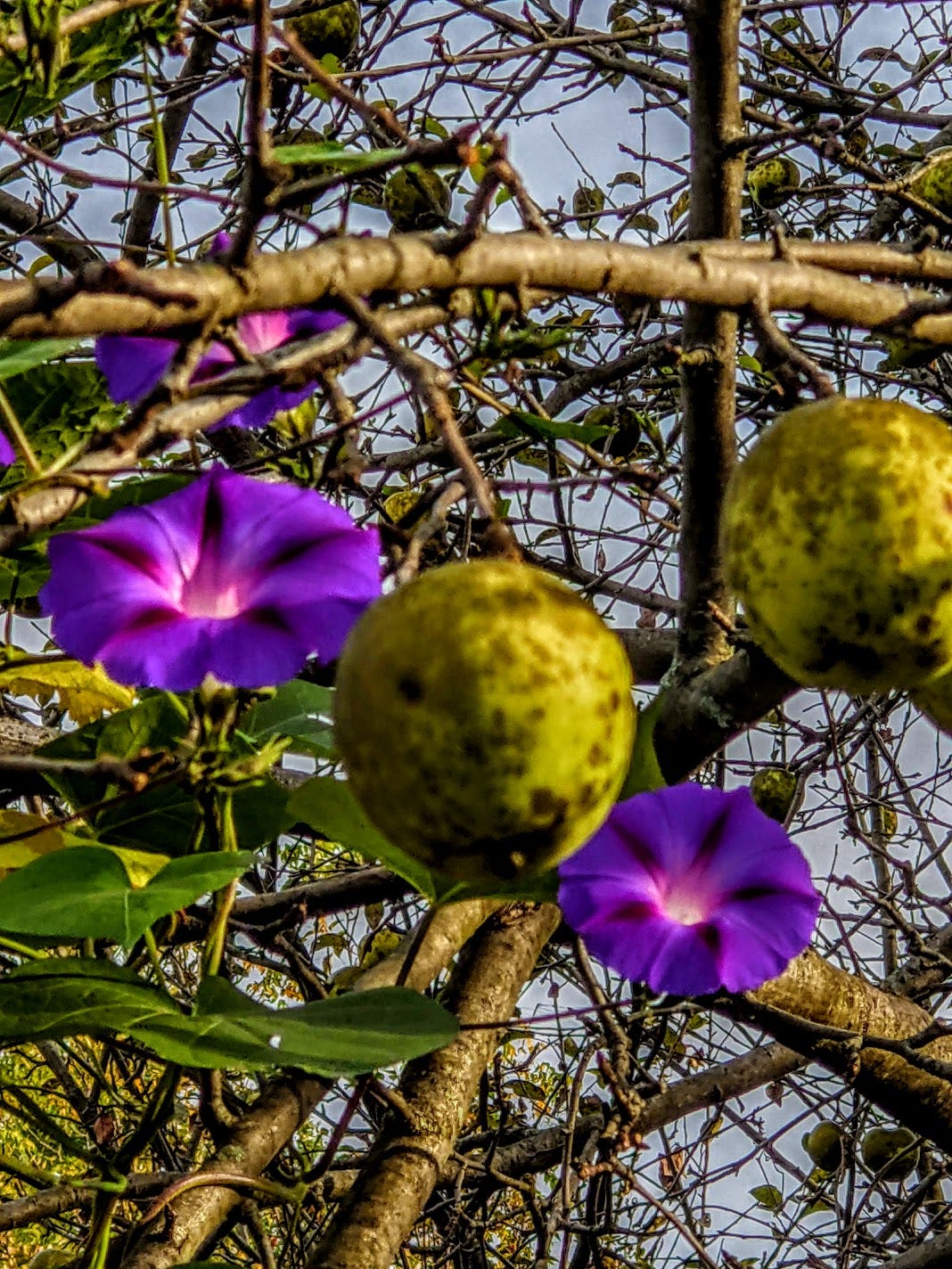 “After he brings up the Morning Glory Teaching — How the gardener thinks they’re weeds — Hedge bindweed — instead of portals to other worlds — or a portal to this one exactly as it is — I notice them growing among the Black Walnuts”