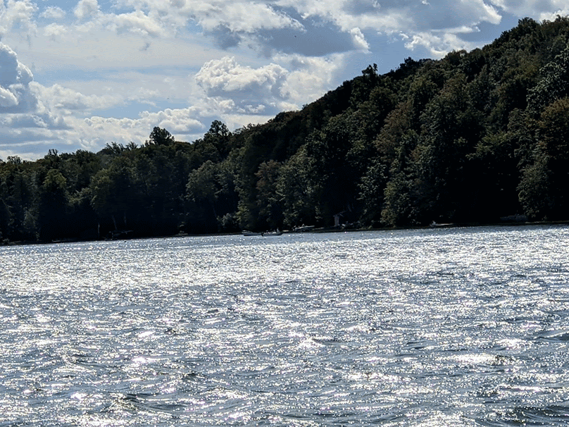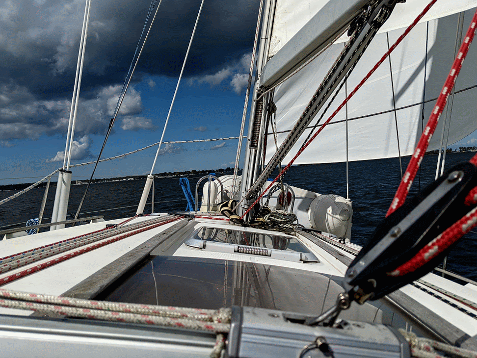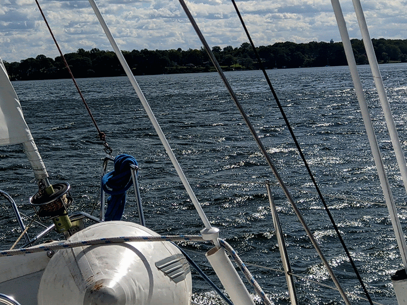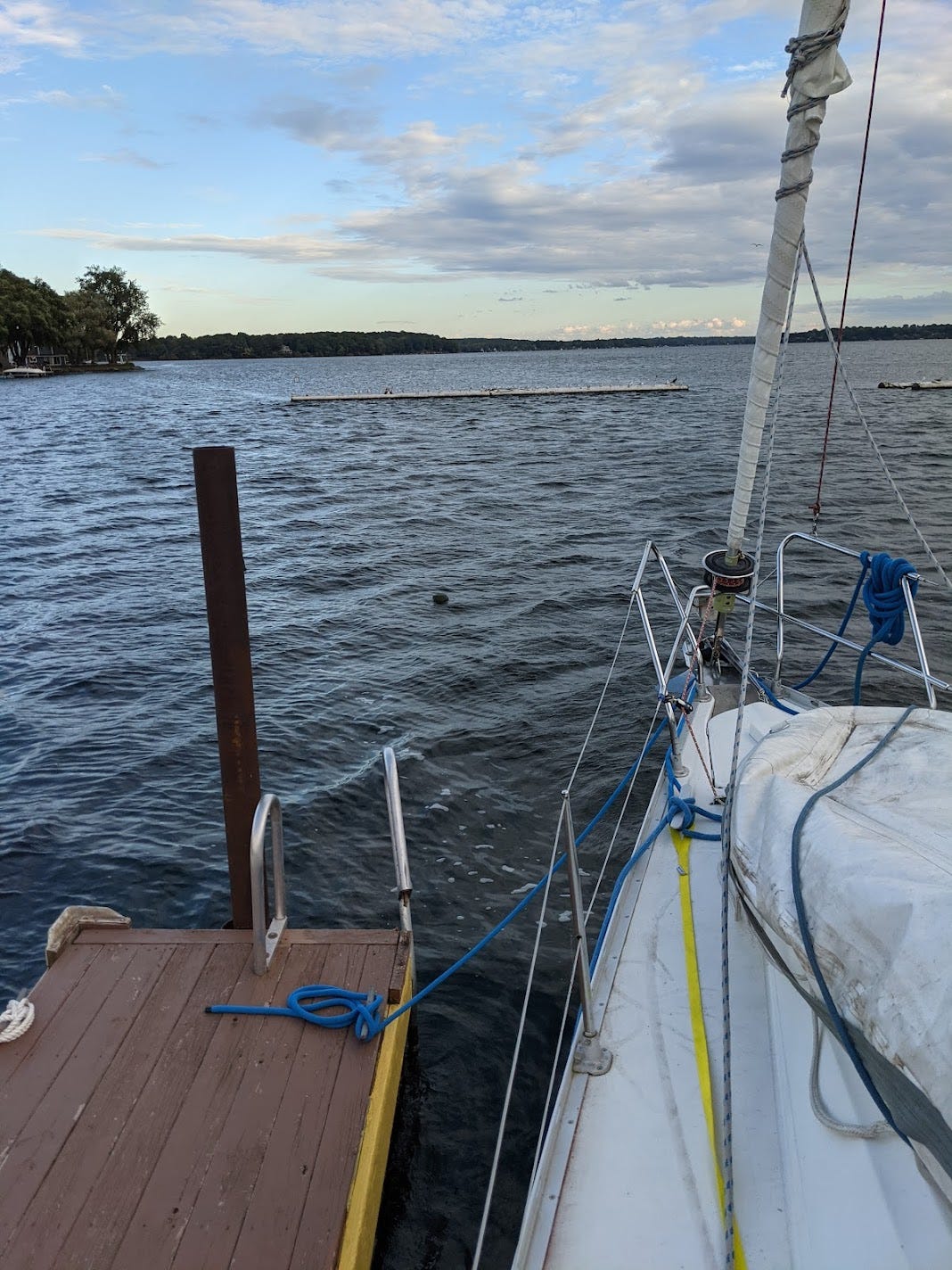 “After taking out a group of Tracy’s adult-kids — spouses and friends — we hooked the ladder at the end of the dock — wind — angle — and inattention were the culprits — in the foreground — we have a wonderful illustration of Virilio’s ‘Accident’ — In the background — we see The Return which is the inevitable result of The Accident”