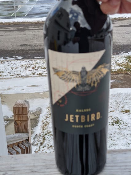 Just below my finger at the top right of the frame is a reflection — what am I holding? Based on the spread pattern of the snow — how does the wine taste? I’m in short sleeves, I haven’t started drinking yet. It’s been 2 weeks since my last indulgence of 7 cigarettes — what is the Dog walker (off-screen) saying to his dog while deliberately not looking at me?