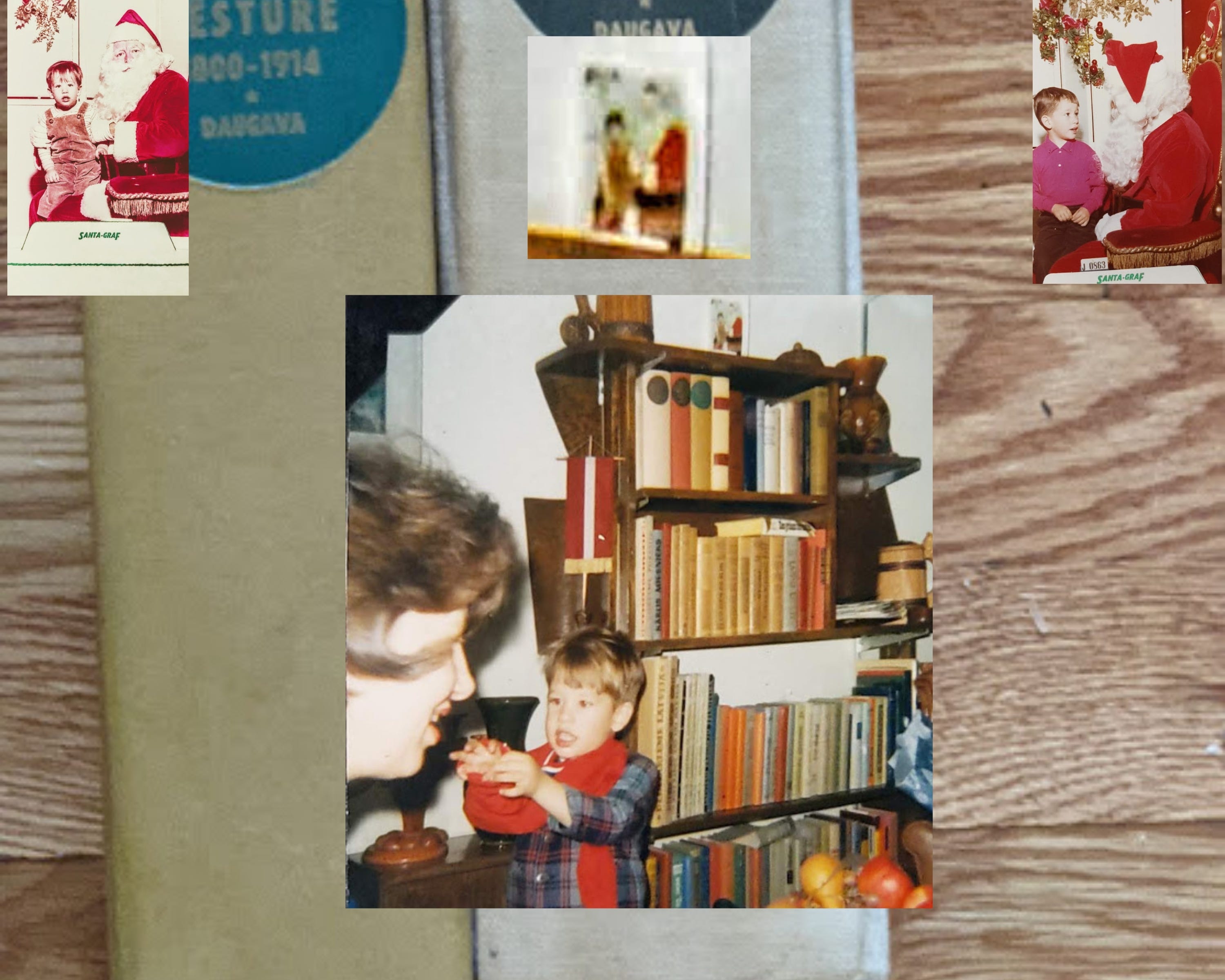 “It’s so easy for us to become confused — Hard to move with and deeper into confusion without grabbing onto delusions of solidity, knowing — Further compounding the inversion of Wake/Sleep is the solidity of the time compared to our virtual, imaginal, disposable culture — The books on the handcrafted shelf are still with me — The picture of Santa and child on the top of the shelf is closer to the original color than the photo I held this week, where the impact of over a half-century of time has transformed it changing ‘green’ to ‘red’ — If you're confused by what I mean, pick up this post, hold it — How does it feel? How does it smell? — What are we thinking? What are we holding? — Which is dreaming? Pictures and words without heft or odor? Or copper, wood, clay, ceramics, and Kodack film stock? — I really don’t know so take my word for it”