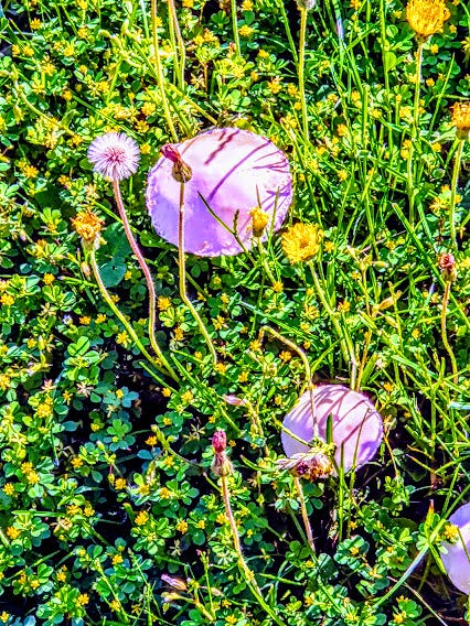 “Through the fields of Purple Mushrooms, surrounded by yellow-headed weeds”