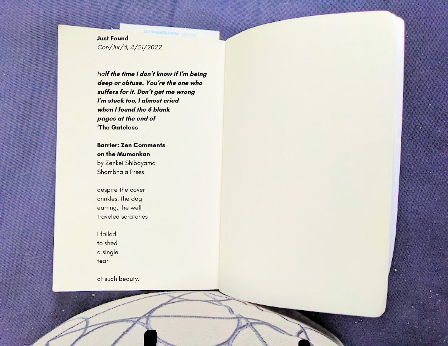Just Found Con/Jur/d, 4/21/2022 Half the time I don’t know if I’m being deep or obtuse. You’re the one who suffers for it. Don’t get me wrong I’m stuck too, I almost cried when I found the 6 blank pages at the end of ‘The Gateless Barrier: Zen Comments on the Mumonkan by Zenkei Shibayama' Shambhala Press despite the cover crinkles, the dog earring, the well traveled scratches I failed to shed a single tear at such beauty.