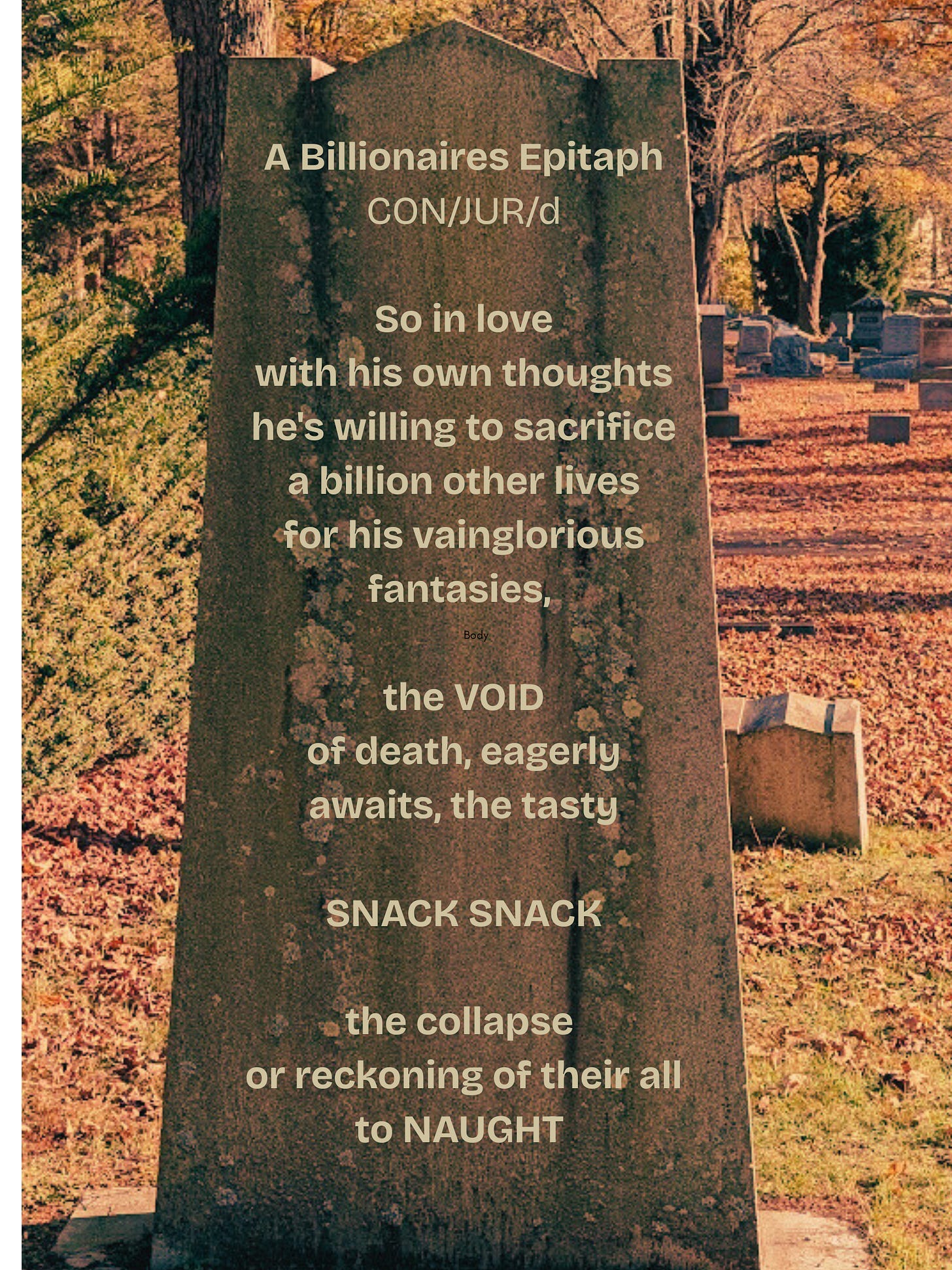 The Moon Is In The House Con/Jur/d, the time of year when the leaves crunch in the cemetery After a lifetime labels of escape saying, You’re THIS We’re THAT Until, like an undead vivisection our labels, LEFT, CENTER, RIGHT hold us pinned to the landscape depressed and afraid of other contour lines, chortling, raging, falling into the darkest, deepest depression when someone suggests other topographies other altitudes, where all we see is FLAT/FLAT or ROUGH/ROUGH, a bland comfort of fear and revulsion, IDIOTS, we say a sort of prayer to the corpse God and his absent father, And yet, where there are Mountains Oceans flourished, on the Uninterrupted Horizons, suddenly a steep elevation appears, rising UP/UP YOU come home and in the kitchen, on the couch at the counter, in the corner, wherever you normally eat, sits the MOON whether WAXING or WANING the immense pressure, is FULL THE GRAVITY deforms the cozy map erases LIKE/DISLIKE LOVE/HATE GOOD/EVIL I’M NOT HUNGRY. they say and you’re glad, because you were wondering, their luminosity was erasing the border between INSIDE and OUT and the word digestive appeared more than once in your ruminations I CAME FROM AROUND HERE A LONG/LONG TIME AGO BEFORE ROCKS AND WHIRLPOOLS GOT COMPLEXIFIED MADE YOUR EARLIEST ANCESTORS time passes (you can’t say how much how little) … AND SO NOW YOU WASTE MY TIME, COUNTING GRAINS OF SAND DRAWING PRETEND BORDERS ALL OVER MY YARD? if you could, you’d ask questions which you already know the answers to like WHY US? WHAT SHOULD WE DO? thoughts like a compass rose arise, although we know where we are, afterwards, when they have left, leaving MOUNTAINS as MOUNTAINS, oceans, ponds and dew drops as reflections of DEPTH THEY brought a reminder when delusions of separateness appear, whichever direction ONE LOOKS/LISTENS there is a GLOW no matter your NAME, PHASE or, CONSTELLATION 0