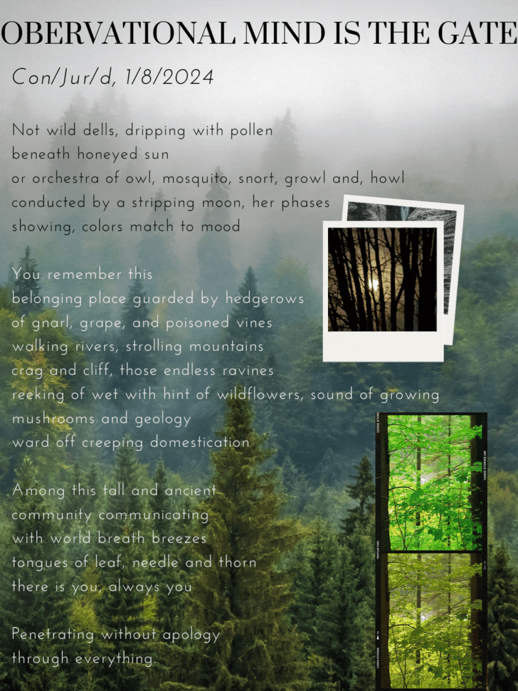 Observational Mind Is The Gate Con/Jur/d, 1/8/2024 Not wild dells, dripping with pollen beneath honeyed sun or orchestra of owl, mosquito, snort, growl and, howl conducted by a stripping moon, her phases showing, colors match to mood You remember this belonging place guarded by hedgerows of gnarl, grape, and poisoned vines walking rivers, strolling mountains crag and cliff, those endless ravines reeking of wet with hint of wildflowers, sound of growing mushrooms and geology ward off creeping domestication Among this tall and ancient community communicating with world breath breezes tongues of leaf, needle and thorn there is you, always you Penetrating without apology through everything.
