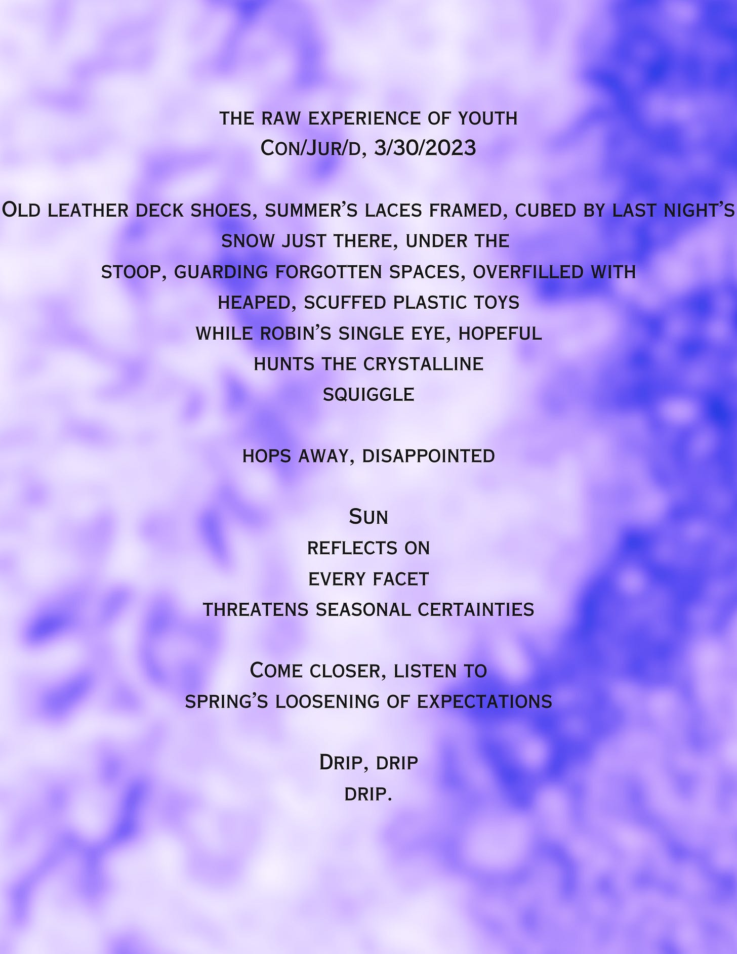 gate(less) poeticsThe raw experience of youth3/29/2023 I make myself laughCon/Jur/dMar 31, 202392ShareSomeone thinks it’s funnyWell, y’all, starting my warmup, expect a poem a day, unless, life in its infinite wisdom, gets in the wayCon/Jur/d, 3/31/2023Join the we that is us that is me for national poetry monthSubscribePreviousNext