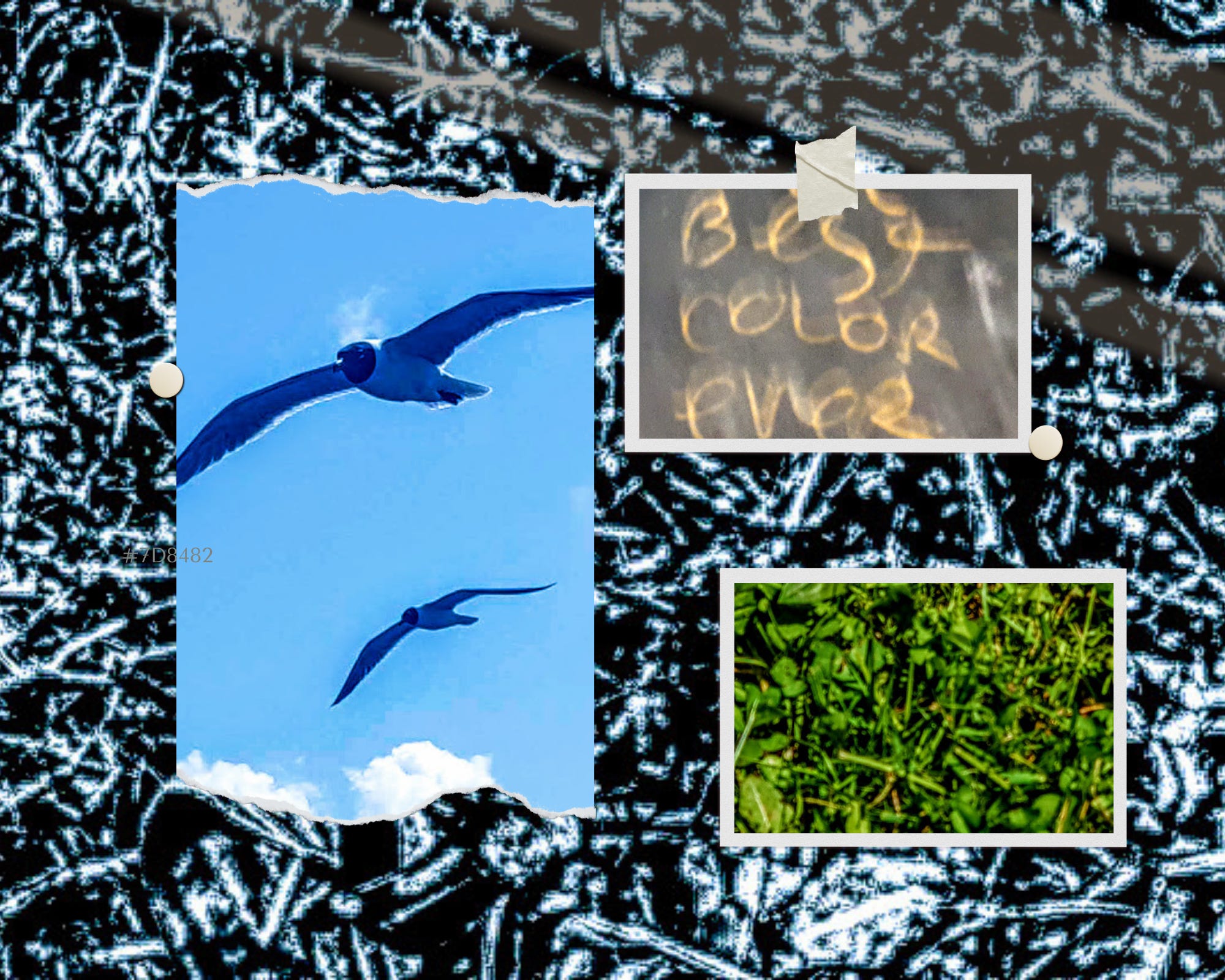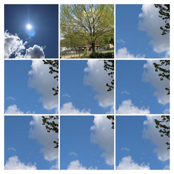 “Laying in the fresh-cut grass, watching wind as it becomes clouds, trees, my face, I take pictures of eternity and later using their digital simulacra, stitch them together, creating a little reality, held together by the illusion of time. This is how we create the illusion of ‘I’ or self, stitching together eternal moments, completely whole in themselves, made separate by temporality, we stitch them together, and pretend the self gives them meaning”