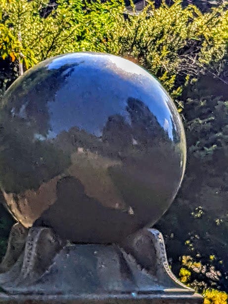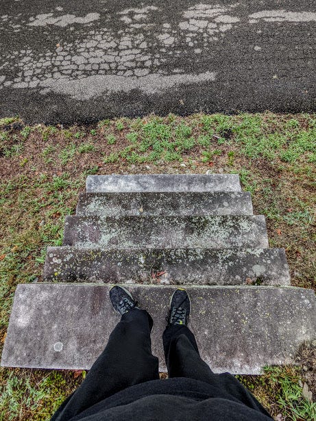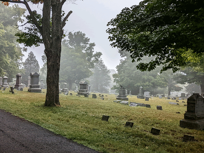 It was a foggy morning — I decided to do the cemetery loop and once there — to sit — it took a long time to find a bench not overly exposed or near the ongoing maintenance activity — you’d think I would be bored going to the local private park for the dead — I’m not — every time something new