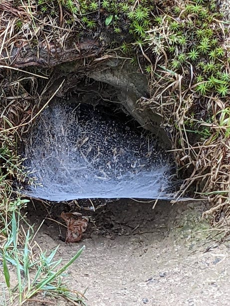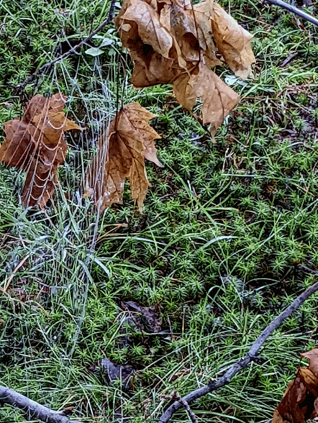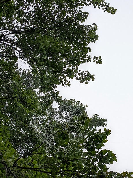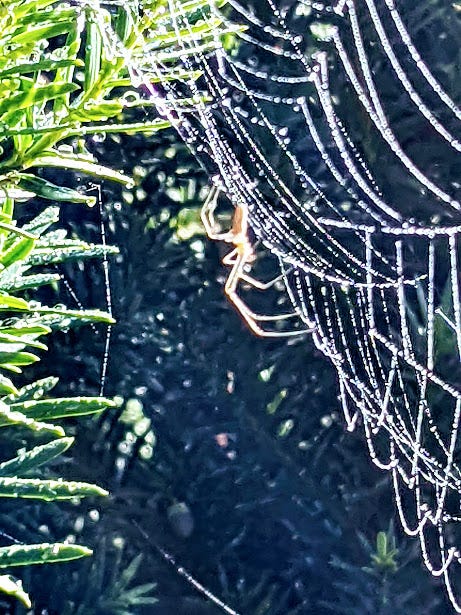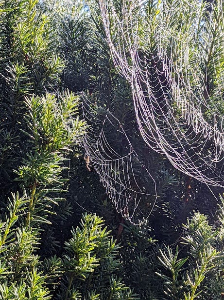 By the time I was done sitting on the Parson’s bench — the fog had burned away — all the webs stood bright and naked — exhibiting generation upon generation of life force